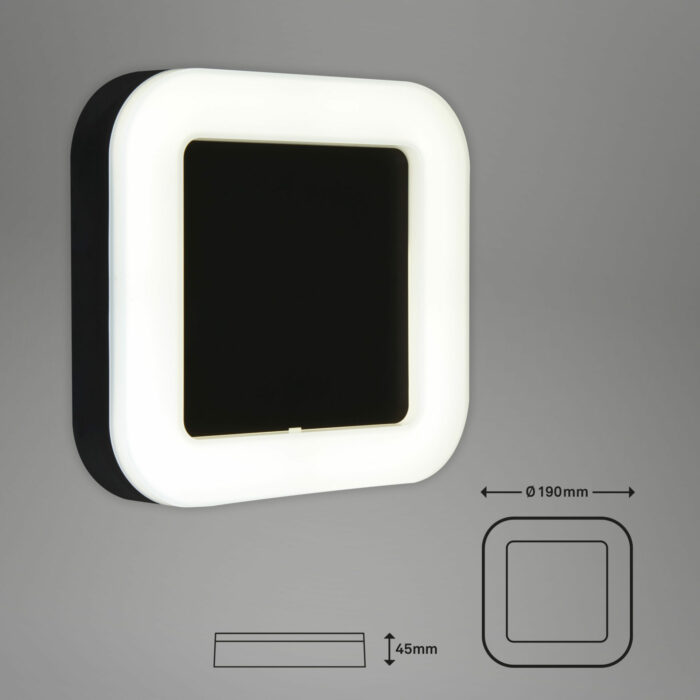 Lampen er designet til vægmontering og har en kompakt størrelse på 19 x 19 x 4,5 cm, hvilket gør den nem at installere på enhver overflade. Den robuste konstruktion i plast og metal sikrer lang holdbarhed, samtidig med at den minimalistiske stil passer harmonisk ind i både moderne og klassiske omgivelser.