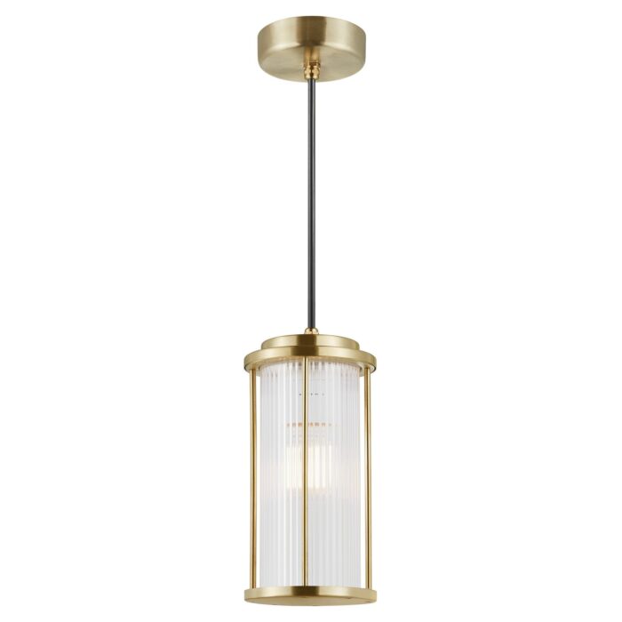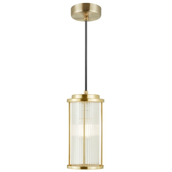 Det ribbede spredeglas sikrer et behageligt, diffust lys og en base lavet af stål i farven messing, der er velegnet til hårdt vejr. Pendlen er vandafvisende og skaber den perfekte stemning til dine udendørsarealer. Meget nem montering med medfølgende loftkop.