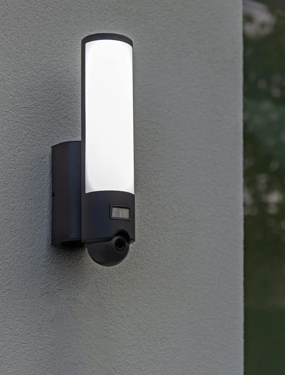 Lutec Elara udendørslampe med kamera og LED-lys i antracit. Smart væglampe med bevægelsessensor, intercom, variabelt lys og 16 GB SD-kort. Perfekt til sikkerhed og stilfuld belysning.
