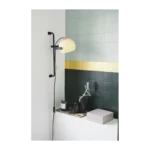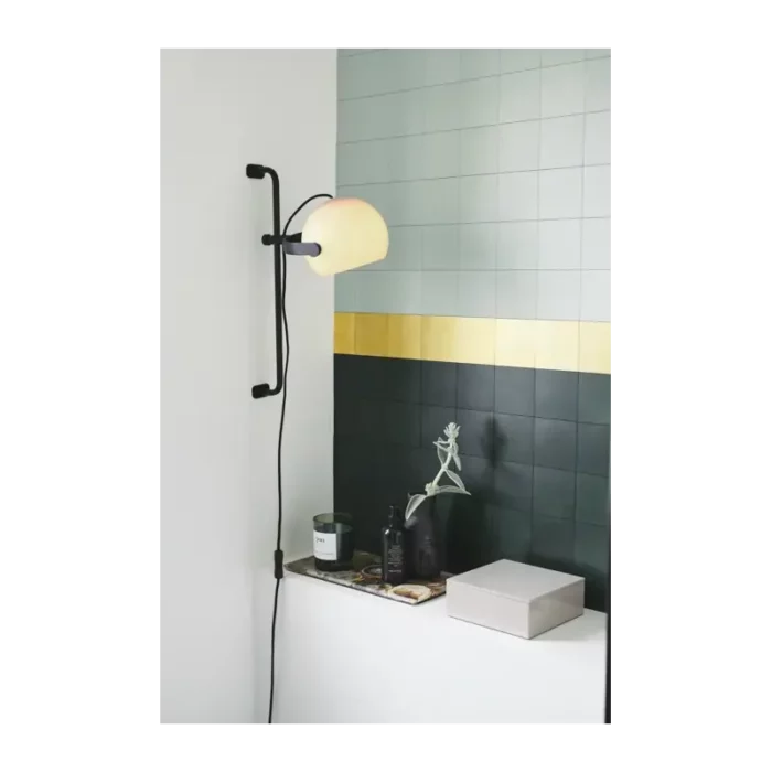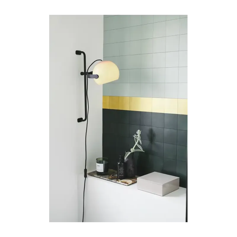 Den opallignende skærm giver et blødt og behageligt lys, mens kombinationen af sortolieret egetræ og sortlakerede aluminiumsknapper tilføjer varme og karakter. Med en smart drejefunktion kan skærmen nemt justeres med én hånd, så lyset altid tilpasses dine behov – perfekt til både læselys og stemningsfuld belysning.